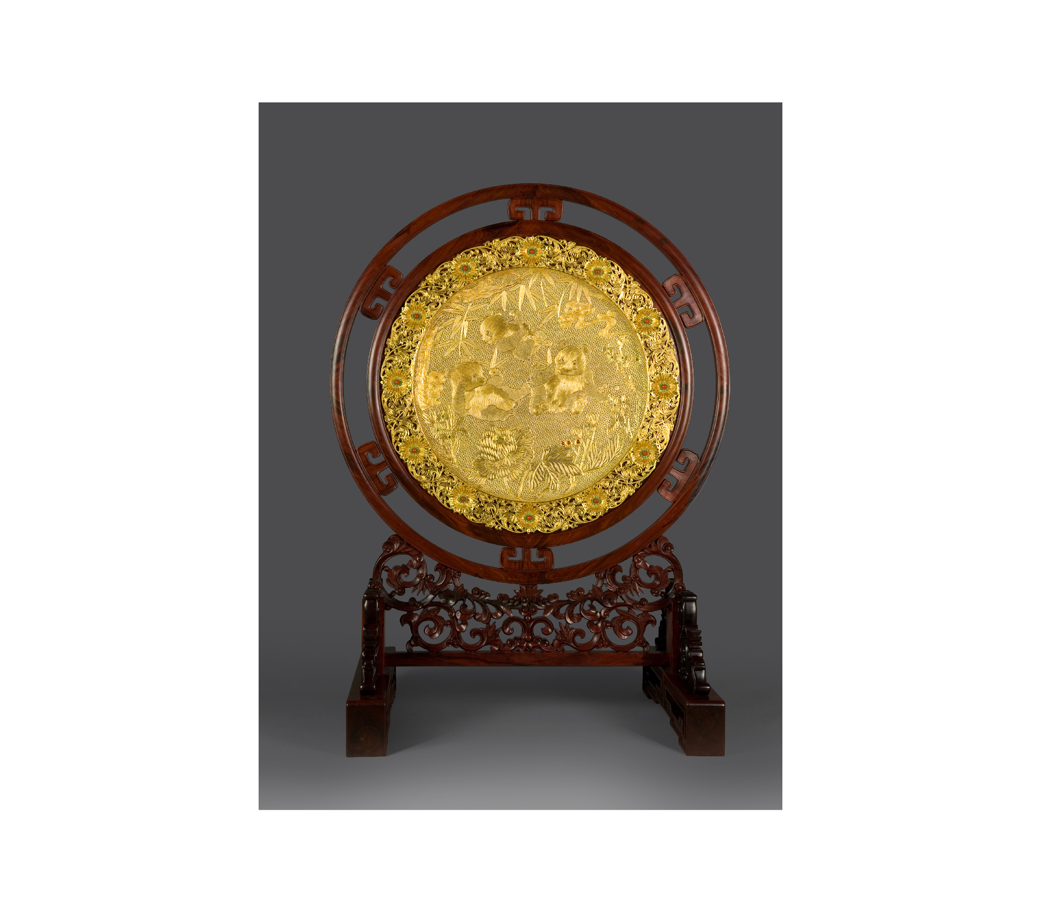 紫檀木雕鑲金銀花絲嵌寶琺瑯玉羽迎春座屏